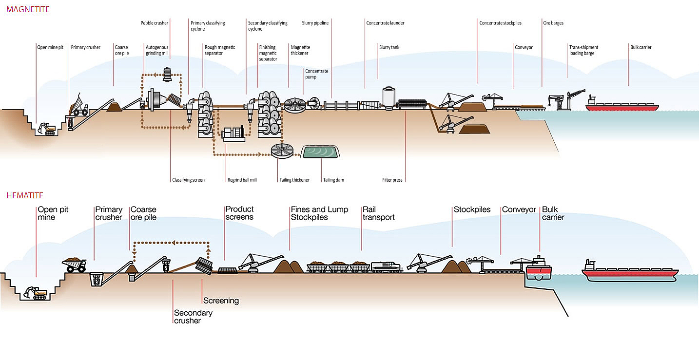 - 磁铁矿需经加工后才能用于生产,选矿流程包括破碎、筛选、研磨、磁选和脱水。